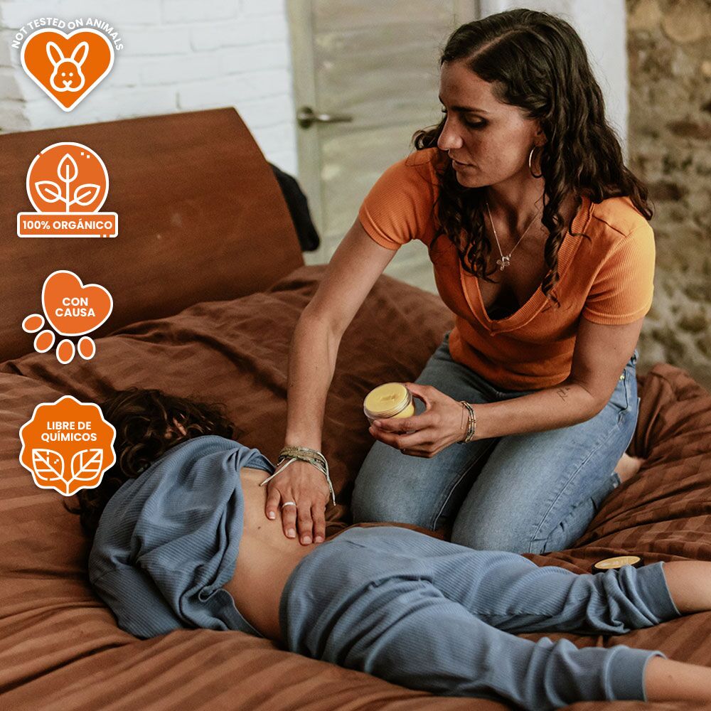 - Instrucciones: Aplique el bálsamo y realice un masaje con cuidado en frente, pies, pecho y espalda.