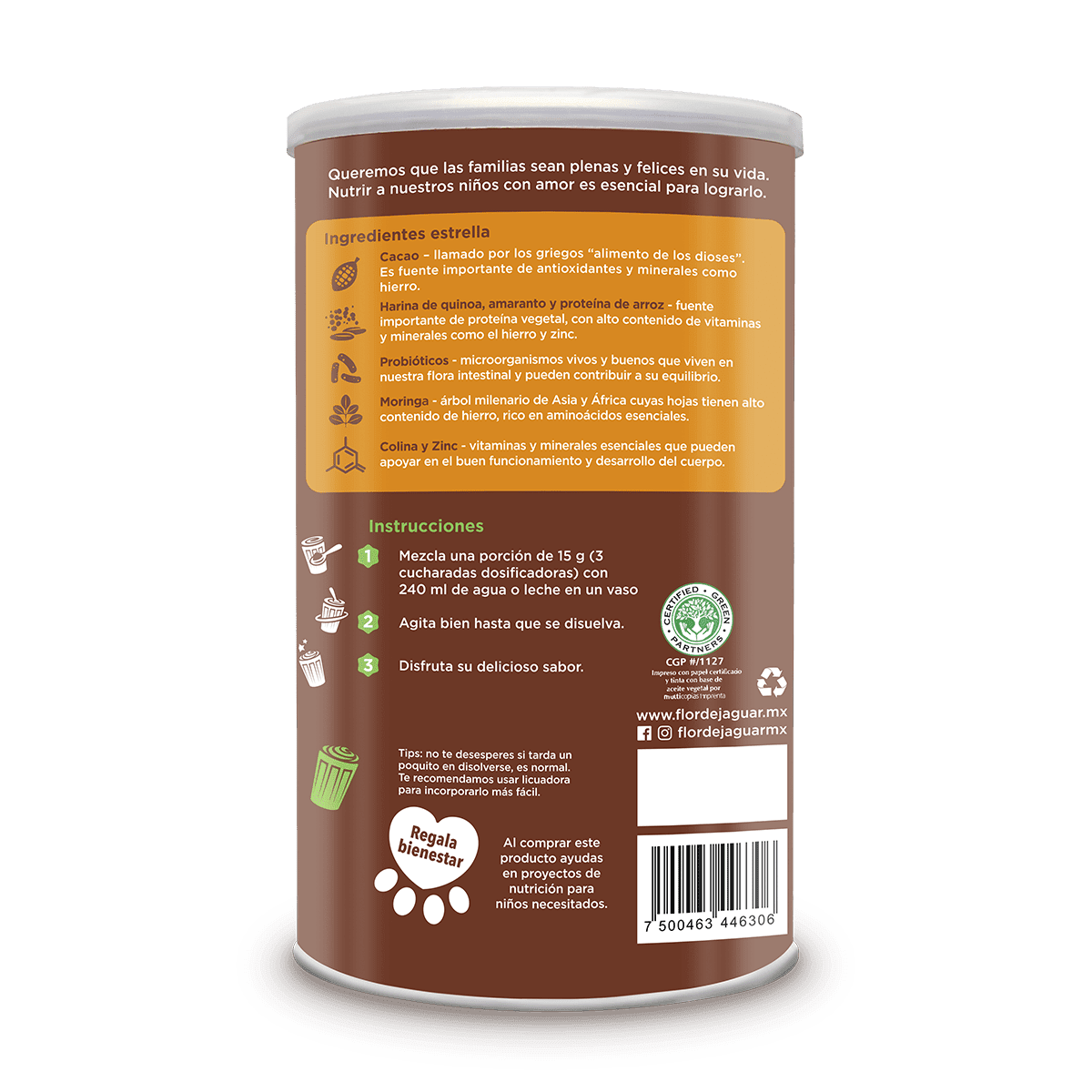- Fuente de proteína vegetal, contiene 7 veces más proteína que los chocolates en polvo tradicionales.