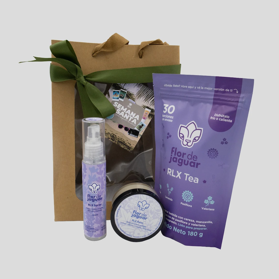 Ritual de descanso y regulación emocional en viajes. Acompaña momentos de pausa y autocuidado durante vacaciones. Incluye: RLX Tea 180 g, RLX Balm 70 g y RLX Spray 70 g.