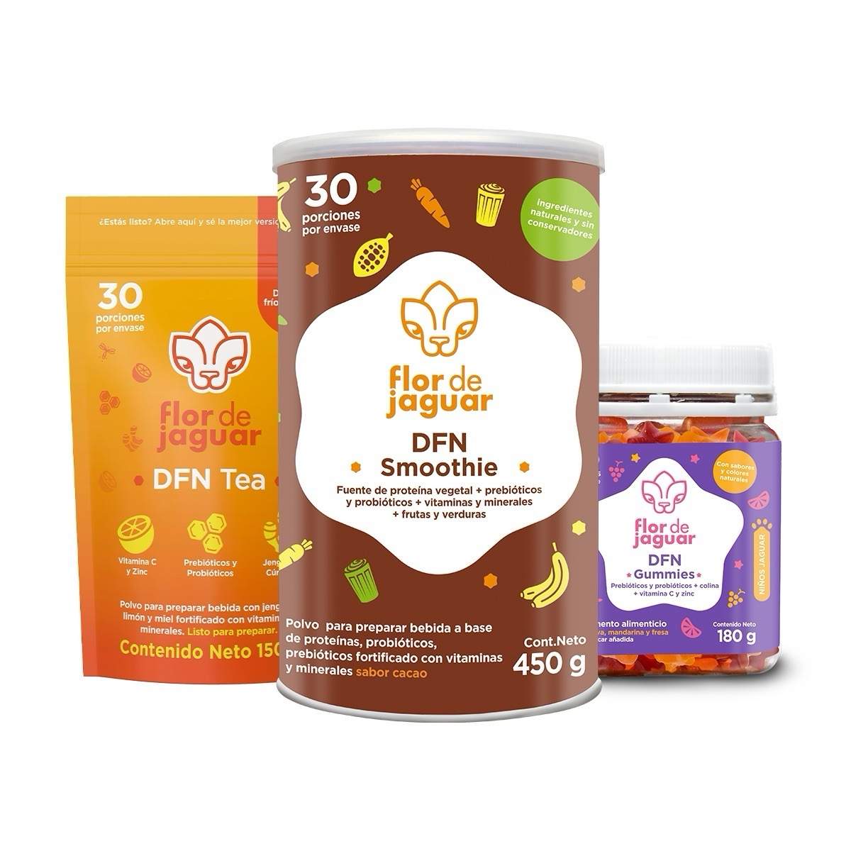 DFN Smoothie: Bebida en polvo con un delicioso sabor que contribuye al desarrollo y fortalecimiento de las defensas de los más pequeños del hogar. Es una mezcla de proteína vegetal + prebióticos y probióticos + vitaminas y minerales + frutas y verduras en polvo, sabor cacao (cacao orgánico y sin conservadores).